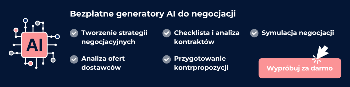 Od zautomatyzowanych chatbotów, które mogą obsługiwać początkowe rozmowy negocjacyjne, po zaawansowane algorytmy, które mogą analizować dane i sugerować optymalne strategie negocjacyjne, AI rewolucjonizuje sposób prowadzenia negocjacji. W tym przewodniku przyjrzymy się różnym sposobom wykorzystania AI w procesach negocjacyjnych, korzyściom i wyzwaniom związanym z używaniem AI w negocjacjach oraz przykładowym narzędziom AI, które przekształcają krajobraz negocjacji. Zobacz też AI w analizie danych zakupowych